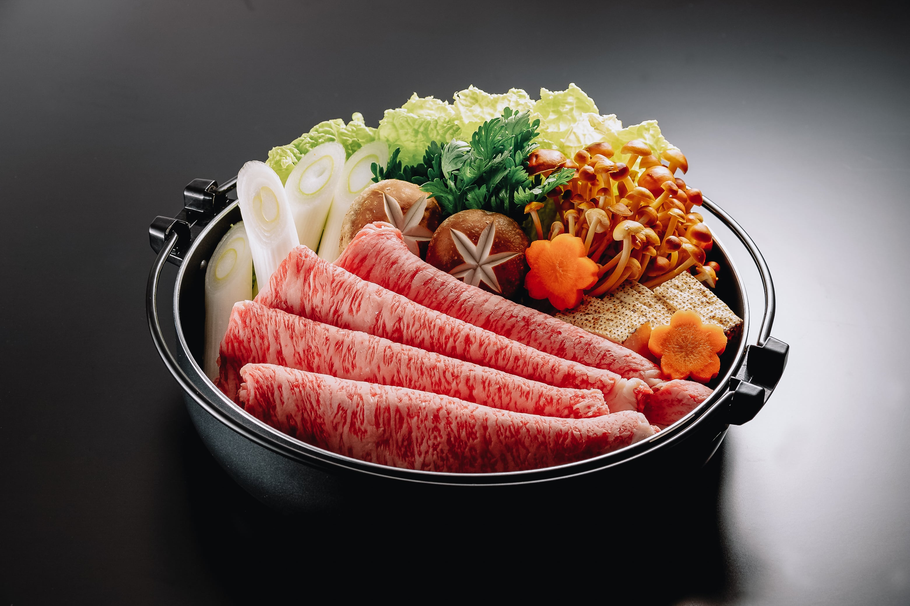 銘柄黒毛和牛(うねめ牛、銘柄福島牛、仙台牛、山形牛、米沢牛、銘柄上州牛など)。その時期に入荷し厳選したA5等級のみを使用します。繊細な肉質と柔らかくなめらかな食感、とろけるような口当たりをすきしゃぶ用でお楽しみください。